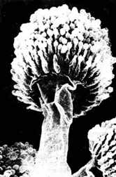 | Sağ tarafta ise Aspergillus cinsi mantarın fotoğrafı görülmektedir. O kadar küçüktür ki, bu görüntü ancak elektron mikroskobu ile elde edilebilmiştir. |