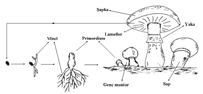 Sporlar, mantarlar için yüksek yapılı bitkilerdeki tohum gibidir. Mantarlar bu yapıdan meydana gelirler. Şapkalı mantarların şapkalarının hemen altında Lamel denilen bir yapı bulunmaktadır. Sporlar bu yapıda oluşurlar. Olgunlaştıktan sonra rüzgar gibi çevre faktörlerinin etkisi ile etrafa yayılırlar. Uygun ortam bulduklarında çimlenerek “Primer misel” adı verilen yapıyı oluştururlar. Bu yapıdan ise “Sekonder misel” adı verilen yapılar meydana gelir. Üstün yapılı bitkiler denilen kök, gövde yaprak gibi yapılara sahip olan bitkilerdeki toprak altı organları, mantarlardaki miseller olarak düşünülebilir. Misellerin toprak altında yayılımının ardından mantarın toprak üstü organları olarak kabul edebileceğimiz yapılar oluşmaya başlar. Toprak üzerinde ilk meydana gelen yapıya “Primordium” adı verilir. Bu yapı olgun mantarın taslağı şeklindedir. Primordiumun gelişmesi ile genç ve olgun mantar meydana gelir. Çok basit olarak anlatılan bu oluşum her mantar için geçerli olmasa da en çok bilinen türleri barındıran ve mantarların sistematikte alt bölümü olan “basidiomycotina” için aşağı-yukarı aynıdır.