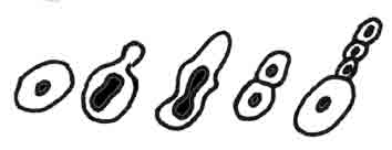 Tomurcuklanma, maya hücresinin tepesinde bir tomurcuk oluşması ile başlar. Ardından çekirdek bu tomurcuğa doğru uzamaya başlar. Uzama sürerken hücre ve çekirdek organelleri kendilerini eşlerler. Eşlemeler yeni oluşacak hücre içindir. Ardından çekirdek ve hücre ikiye ayrılır ve yeni hücre meydana gelir. Bu olay birbiri ardınca devam ederek bir hücreden birçok yeni hücre meydana gelir. Yoğurt ve peynir vs. yapımında beklemenin nedeni bu maya hücrelerinin tomurcuklanarak kendilerini eşlemeleri içindir.